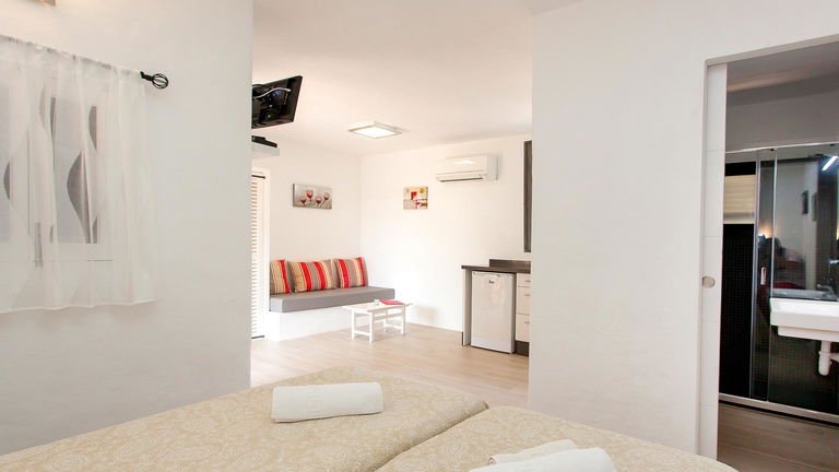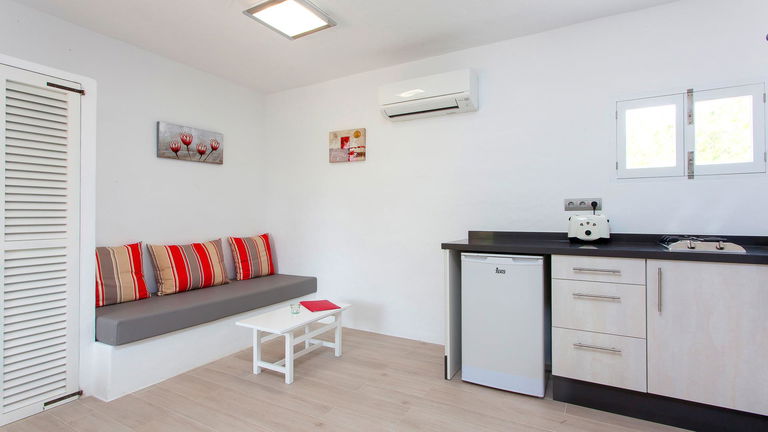 Este estudio rústico dispone de aire acondicionado, porche privado amueblado, ventilador, sofá, TV de pantalla plana y baño privado con ducha. La zona de cocina está equipada con nevera, tostadora y cafetera.